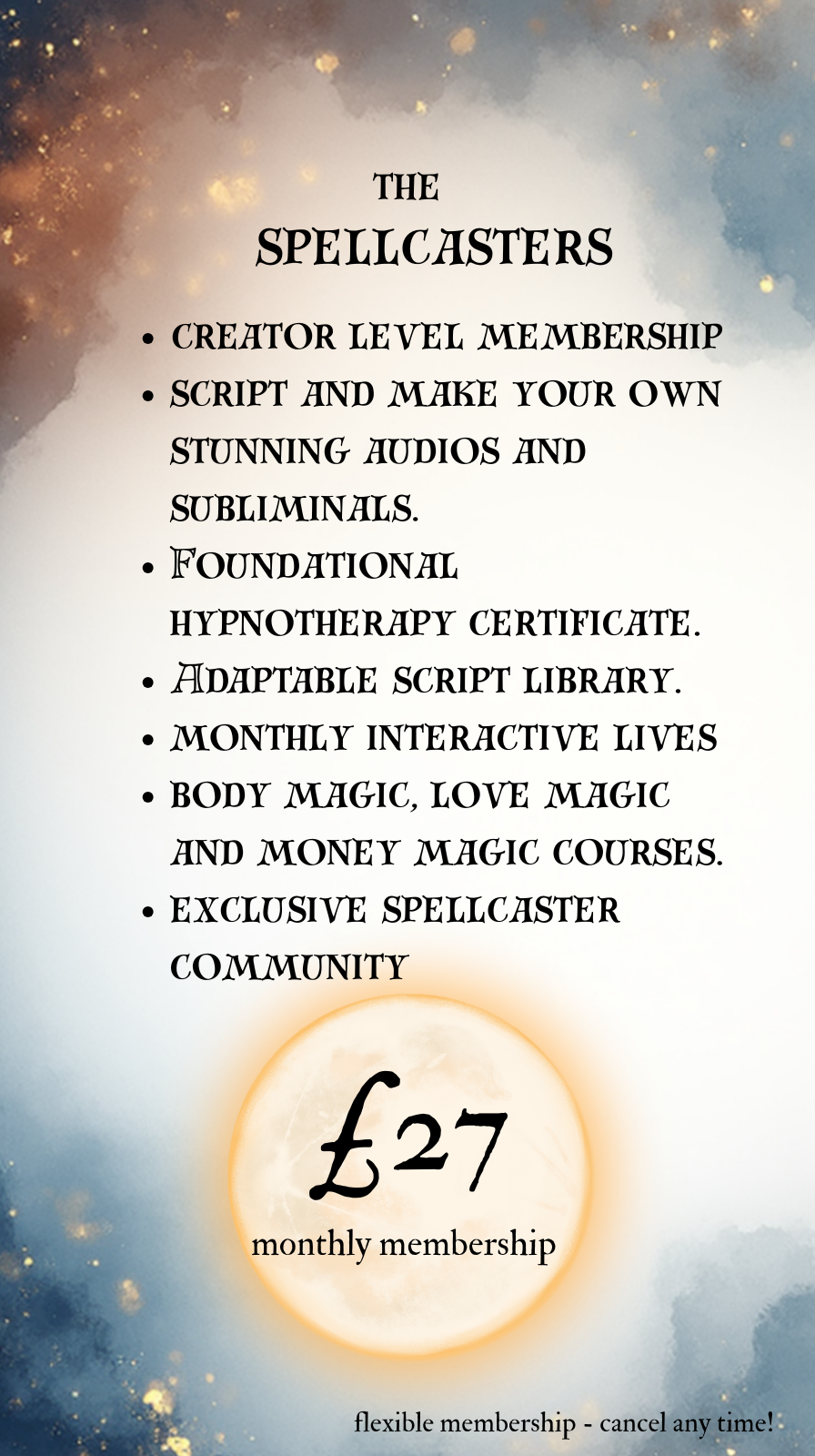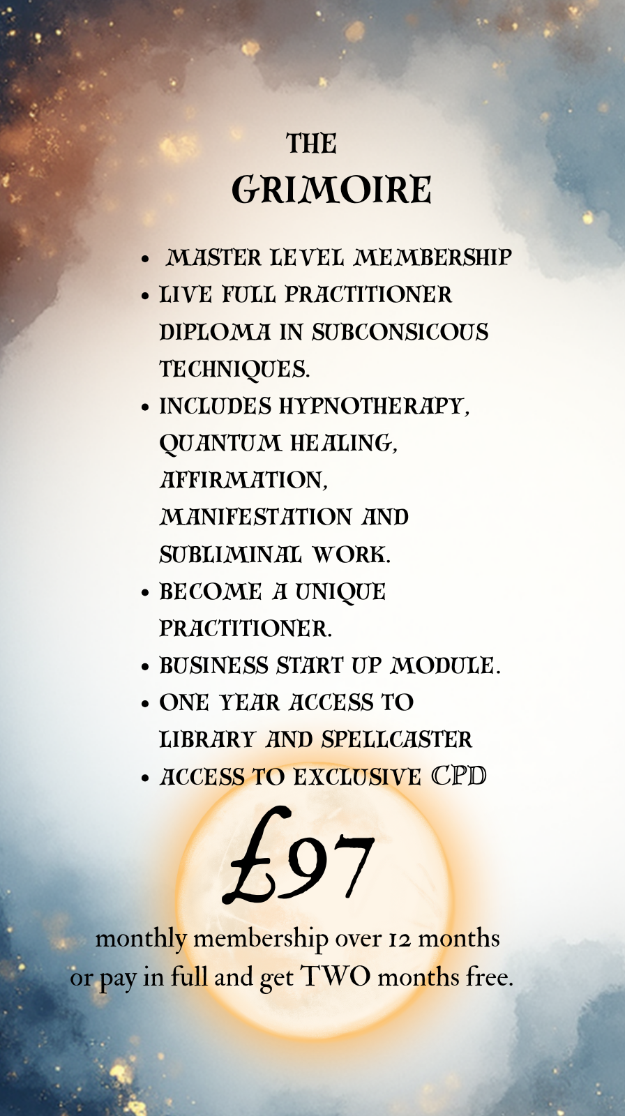 Make your own subliminals, guide your own meditations and feel the unique superpower of speaking to your own subconscious. Learn the power of self-hypnosis and making your own scripts. Learn at a pace that suits you, as little, as often and as much as you need, from foundation techniques right through to our Mind Magic Grimoire diploma that gives you the ability to practice as a coach or hypnotherapist. Learn the power of your everyday words in changing your life. Words are spells after all, and that is the first lesson of the library...